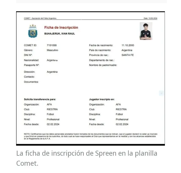 A su vez, posteriormente se reveló la ficha de inscripción de Buhajeruk en la Asociación del Fútbol Argentino como jugador de Deportivo Riestra. Cabe destacar que, el próximo 11 de octubre, “Spreen” festejará su cumpleaños número 24.