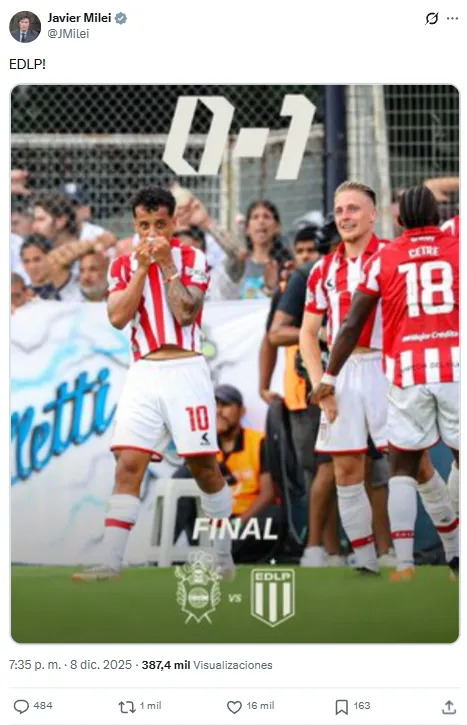 - Javier Milei publicó un mensaje en redes tras la victoria de Estudiantes.