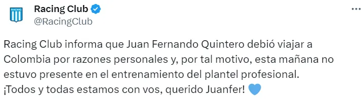 “Racing Club informa que Juan Fernando Quintero debió viajar a Colombia por razones personales y, por tal motivo, esta mañana no estuvo presente en el entrenamiento del plantel profesional. ¡Todos y todas estamos con vos, querido Juanfer!”, publicó Racing en su cuenta de Twitter oficial. Si bien no se detalló el motivo del viaje de Juanfer, lo que se sabe -a partir de historias de Instagram que compartió el talentoso mediocampista- es que se necesitaban dadores de sangre para un familiar cercano.