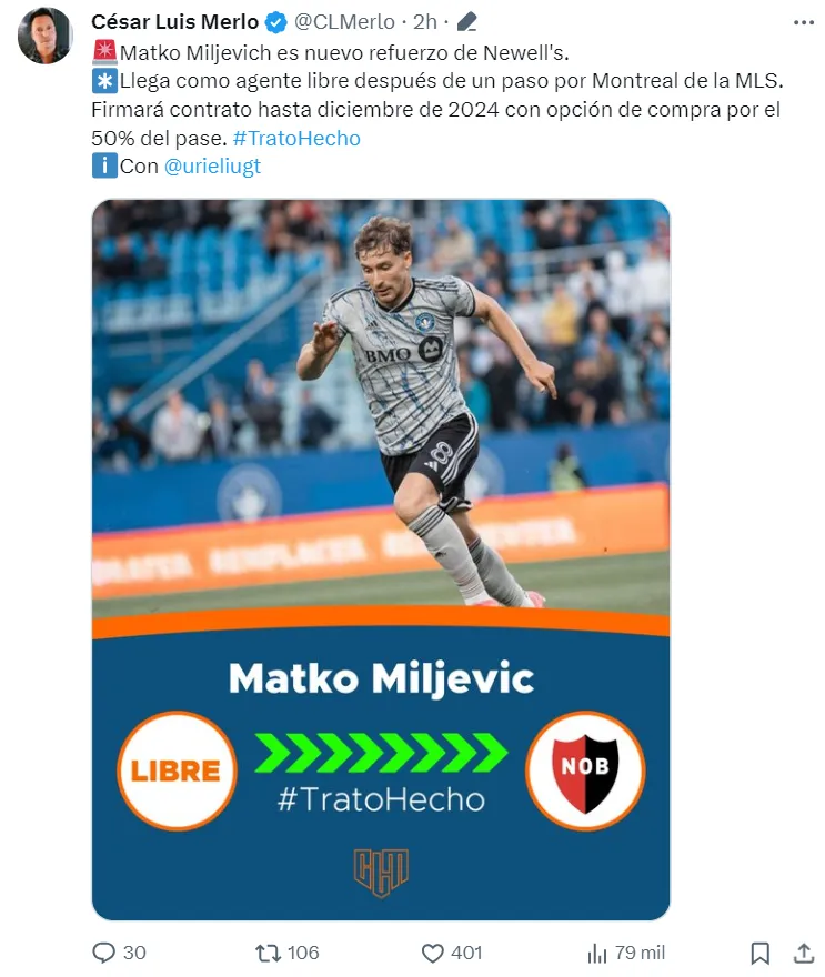 Con el mercado de pases terminado, solo los clubes argentinos que hayan vendido o prestado al exterior tienen la posibilidad de seguir incorporando. Uno de ellos es Newell’s Old Boys, quien acaba de abrochar la contratación de Matko Miljevic.