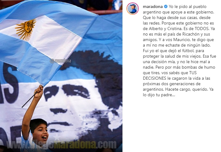 Durante el comienzo del gobierno de Alberto Fernández, Macri recurrió a sus clásicas analogías y comparó a Cristina Fernández de Kirchner con Diego Maradona, algo que no le gustó al Pelusa. Es así que le dedicó un posteo en Instagram que posteriormente fue borrado por su familia. Lo repasamos completo: