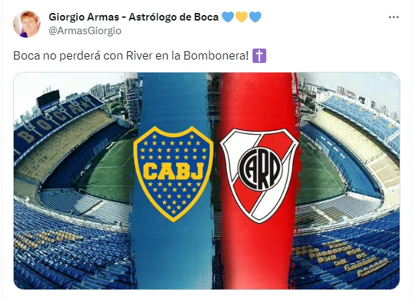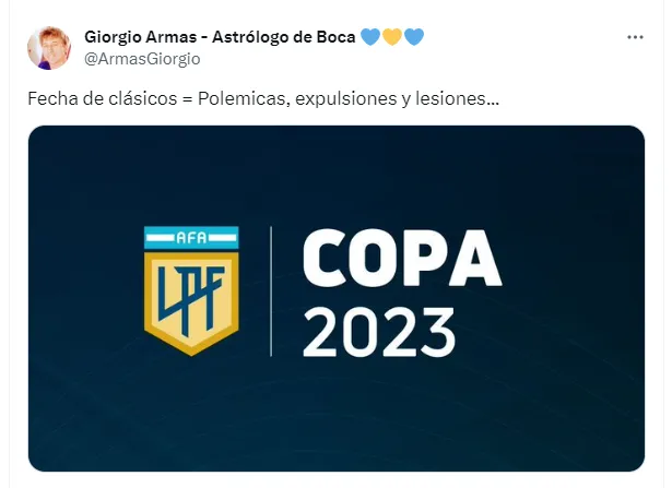 Referido a esta particular jornada, el reconocido astrólogo hincha de Boca, Giorgio Armas, hizo un fuerte posteo en su cuenta de Twitter, en el que si bien no dio resultados explicó que la “Fecha de clásicos = Polemicas, expulsiones y lesiones…”.