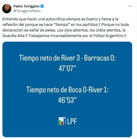 En ese contexto, la primera respuesta desde AFA llegó por parte de Pablo Toviggino, mano derecha del Chiqui Tapia en la casa madre del fútbol argentino. De forma sutil, citando el dato de tiempo efectivo en la comparación con el último Superclásico, el tesorero invitó a la reflexión.