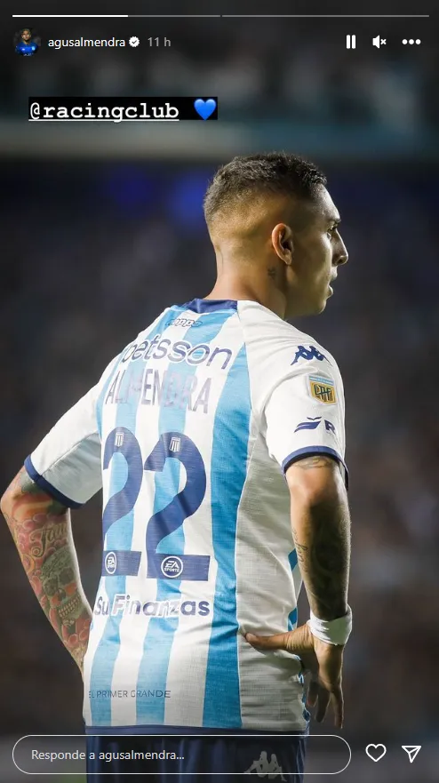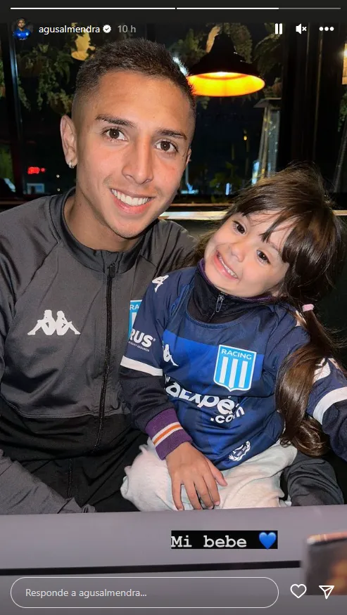 Contrario a como reaccionó en otros momentos, la postura mediática de Almendra tras el clásico en Avellaneda fue mesurada: posteo de una imagen suya durante el partido, con un corazón dedicado para la Academia, y luego una selfie con su hija Francesca Isabella a través de su cuenta oficial en Instagram.