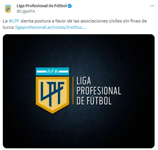 Por todos esos logros y características, los clubes de la LPF ratifican su posicionamiento histórico al formato que lo hizo grande a través de los tiempos: el de asociaciones civiles sin fines de lucro. El mismo que hizo un gigante del mundo al querido y admirado fútbol argentino.