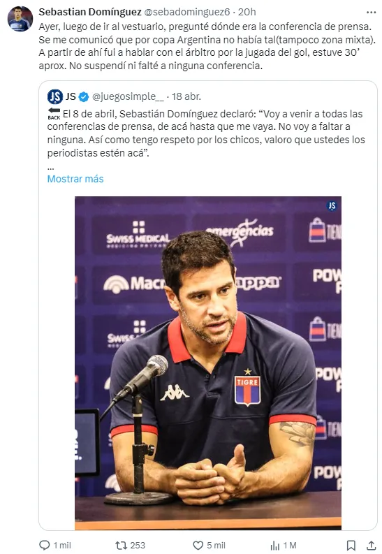 Por este motivo y con el fin de evitar malos entendidos, el estratega utilizó sus redes para aclarar la situación: “Luego de ir al vestuario, pregunté dónde era la conferencia de prensa. Se me comunicó que por Copa Argentina no había tal (tampoco zona mixta)“.