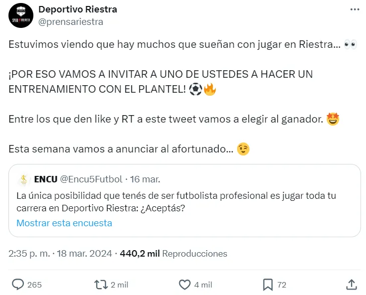 Desde su cuenta oficial de Twitter, Riestra citó al tuit en cuestión y propuso: “Estuvimos viendo que hay muchos que sueñan con jugar en Riestra. Por eso vamos a invitar a uno de ustedes a hacer un entrenamiento con el plantel. Entre los den like y RT a este tweet vamos a elegir al ganador. Esta semana vamos a anunciar al afortunado”.