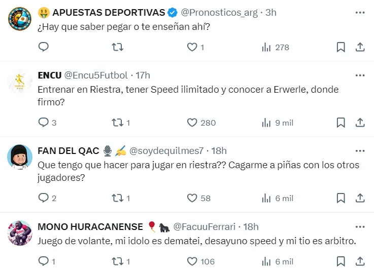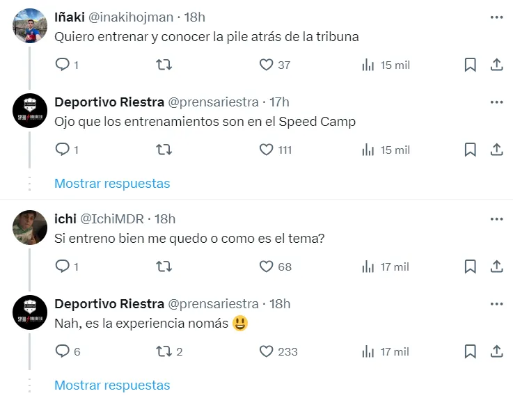Riestra tiene sus particularidades y pareciera que les gusta hace gala de eso. Desde poner una DJ a tocar en la previa de los partidos, la forma de los bancos de suplentes con forma de lata de energizante, la ya mencionada pretemporada exótica en Pinamar. Ahora se dio la interacción con una cuenta de encuestas y la posterior invitación a entrenar con el plantel profesional. Quedará en cada uno determinar si es interacción genuina con sus hinchas o si es puro show para viralizarse.