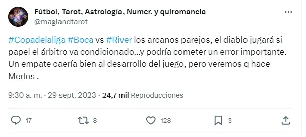 A dos días de este encuentro, y como suele hacerlo en la previa de cada fecha, el perfil de Twitter @magiandtarot, hizo un posteo con la predicción de este Superclásico, y allí llamó la atención, debido a que puso énfasis en lo que será el desempeño del árbitro Andrés Merlos.