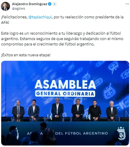 Entre las repercusiones, se destacó el mensaje de Alejandro Domínguez, que rápidamente se hizo presente a través de sus redes sociales para felicitar a Tapia por su reelección en Argentina.