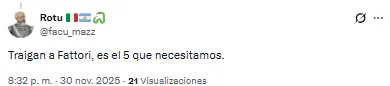 El mediocampista complicó el panorama para el Xeneize, que tuvo que batallar de más para conseguir el boleto a las semifinales. En ese contexto, hinchas de todos los clubes de la Primera elogiaron a Fattori y lo pidieron para sus equipos en el próximo mercado de pases.