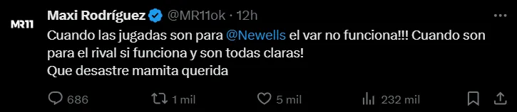 “Cuando las jugadas son para Newell´s, el VAR no funciona!!! Cuando son para el rival, el VAR sí funciona y son todas claras! Que desastre mamita querida”, escribió Maxi en su cuenta de X. El posteo del ídolo leproso tuvo gran repercusión con más de 650 comentarios y 5 mil likes. La situación de la Lepra no es agradable y el referente sintió impotencia por algunas jugadas que creyó injustas.