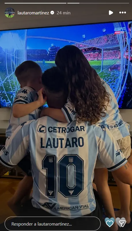 Mediante una tierna historia de Instagram junto a sus dos hijos, el delantero de la Selección Argentina dejó en claro que su noche italiana de sábado. Como detalle, Lautaro Martínez se mostró con una camiseta con el dorsal 10 y su nombre, pero con la camiseta actual de Racing. Sus hijos también posaron con la pilcha académica, mientras en la TV se mostraban los instantes previos al inicio del partido.