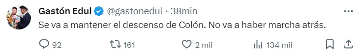 “Se va a mantener el descenso de Colón. No va a haber marcha atrás”, confirmó el periodista en su cuenta de Twitter. De esta manera, el Negro tendrá que jugar en la segunda categoría del fútbol argentino y queda totalmente descartada la chance de que haya 29 equipos en Primera.