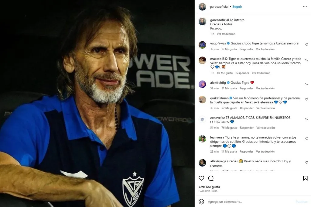Tras conocerse la durísima noticia para los hinchas del Fortín, en redes sociales se difundió la captura de un presunto mensaje del exentrenador del club a través de un perfil de Instagram. “Lo intenté ¡Gracias a todos! Ricardo”, decía el mensaje que difundió la cuenta @garecaoficial. Sin embargo, Richard no se maneja con plataformas digitales y se trata de un posteo falso.