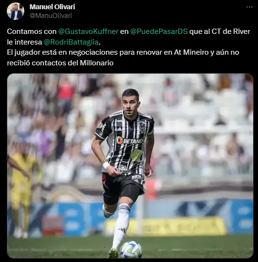 El periodista Gustavo Kuffner en D-Sports Radio informó que “al cuerpo técnico de River le interesa Rodrigo Battaglia”. Pese a este deseo de contar con el mediocampista surgido en Huracán y con pasado en el fútbol argentino en el propio Globo, Racing y Rosario Central, el jornalista destacó que Battaglia “está en negociaciones para renovar en Atlético Mineiro y aún no recibió contactos del Millonario”.