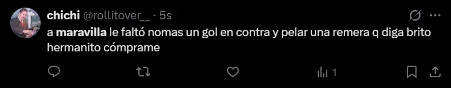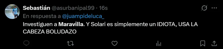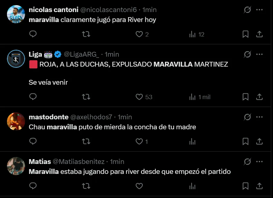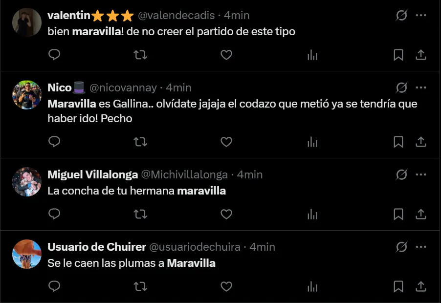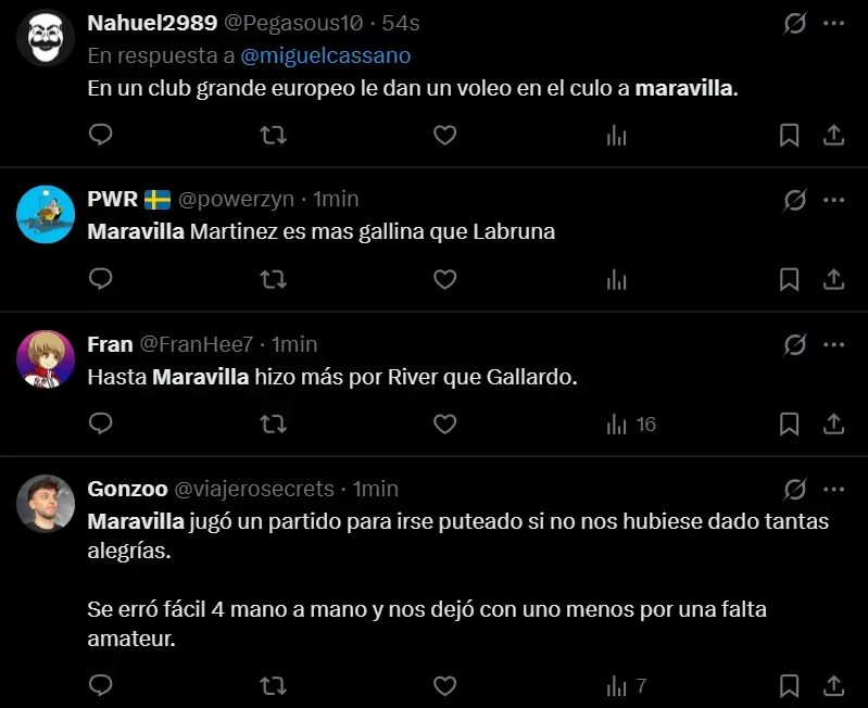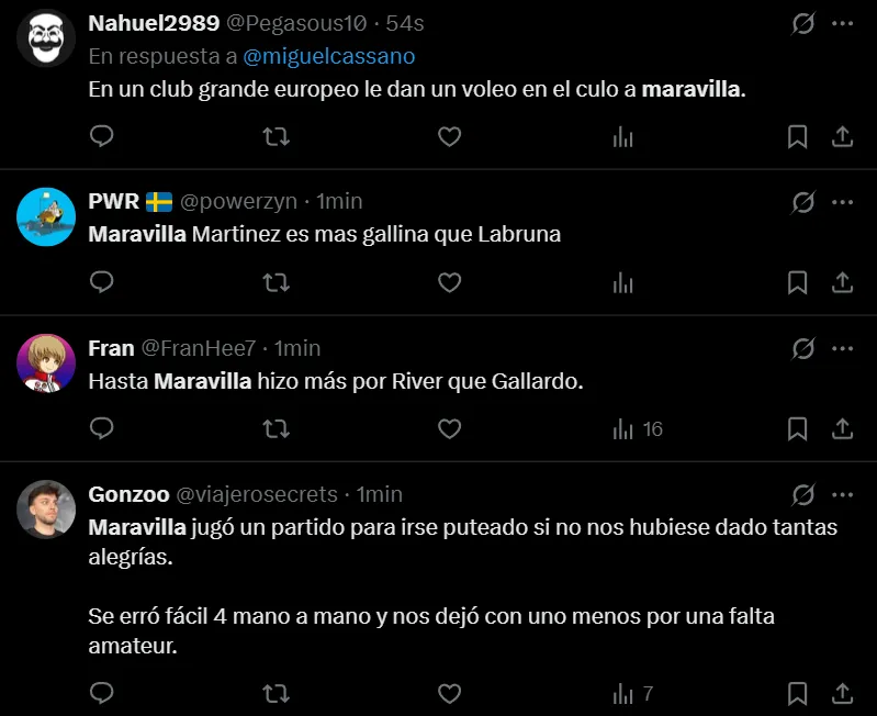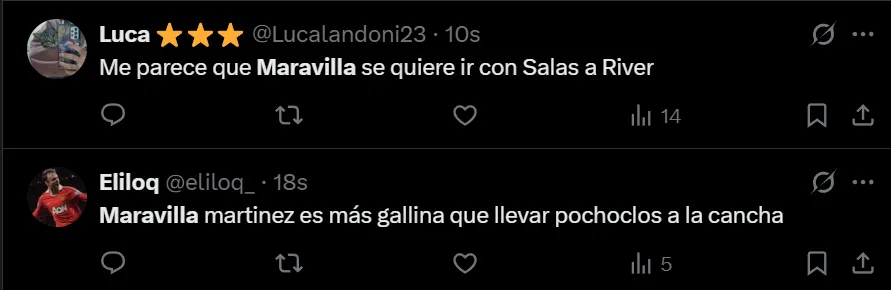 “Bien, Maravilla. De no creer el partido de este tipo”, escribió @valendecadis a través de Twitter, quien se mostró muy molesto por la actuación que tuvo el máximo artillero internacional de la historia de Racing, que afrontó un muy flojo cotejo. Así como lo criticó el usuario de la red social del pajarito, también hubo otros comentarios en donde recordaron su simpatía por el Millonario.