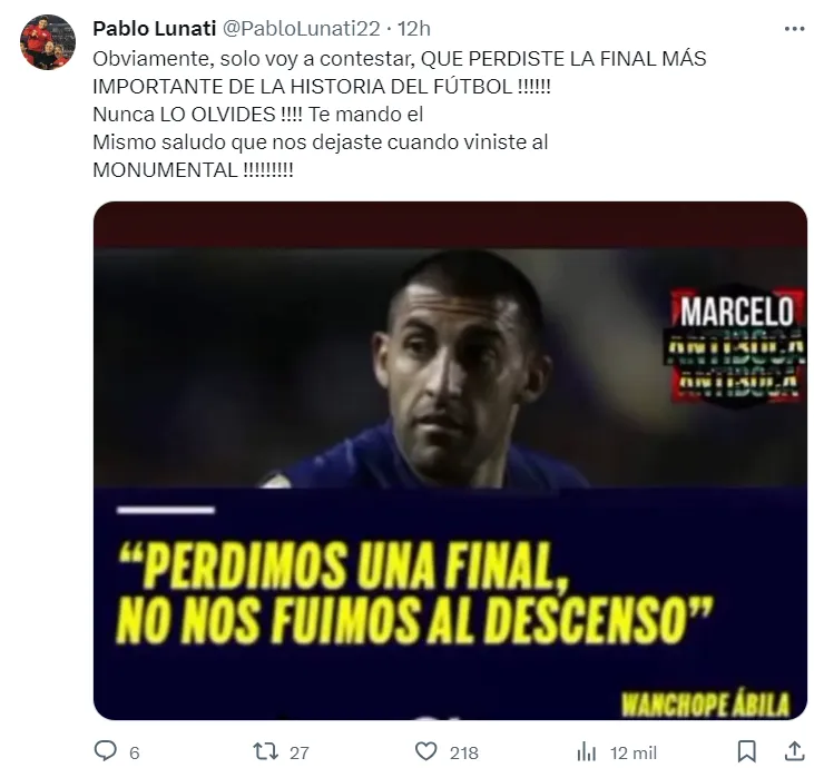 Los hinchas de River no dejaron pasar la oportunidad para pegarle a Wanchope, con quien tuvieron varios cruces en su paso por Boca. Pablo Lunati, fanático del Millonario, aprovechó sus redes sociales para dedicarle un fuerte mensaje al atacante cordobés.
