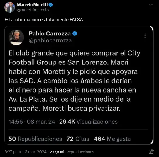 Marcelo Moretti salió a desmentir el testimonio del periodista del mismo modo, ya que desde su cuenta de Twitter, la máxima autoridad vigente de San Lorenzo señaló: “Esta información es totalmente FALSA“. En los comentarios, los hinchas del Ciclón se mostraron conformes ante la confirmación que su club no será vendido al City Group. Respecto a las declaraciones de Milei sobre el desembarco del grupo empresario en Argentina, las mismas serían sobre otro club, ya que desde San Lorenzo confirmaron que no son ciertos los rumores.