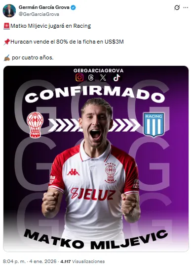 - Racing acordó la compra de Matko Miljevic a Huracán por 3 millones de dólares.