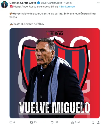 Según la información de Germán García Grova, Miguel Ángel Russo llegó a un acuerdo verbal con San Lorenzo para convertirse en el nuevo entrenador. En las próximas horas habrá un nuevo encuentro para pulir los últimos detalles y estampar la firma en los contratos.