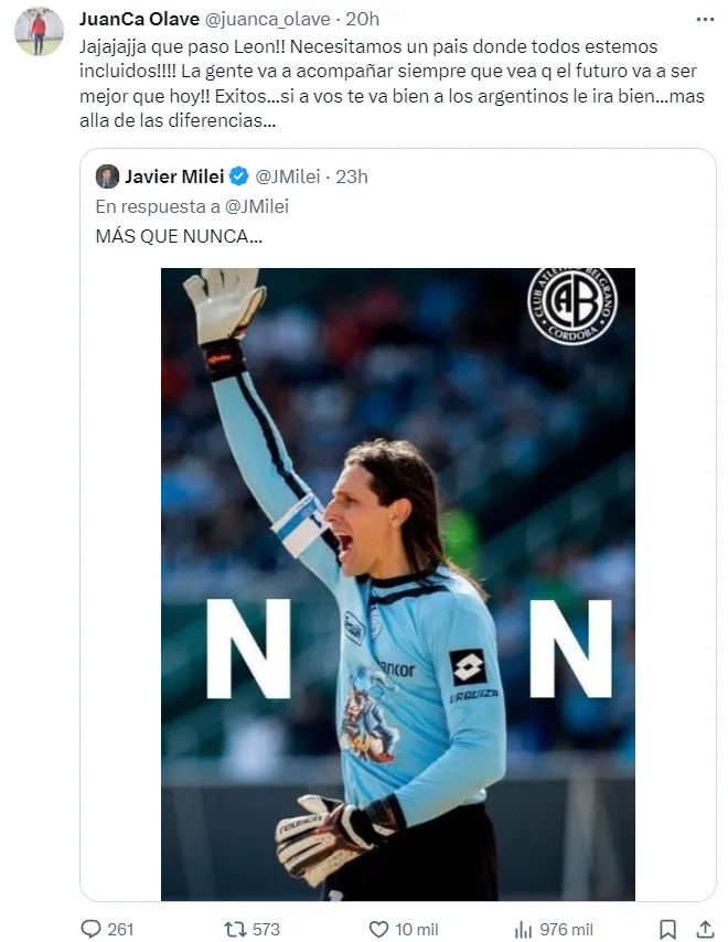 Por más extraño que parezca, Javier Milei y Juan Carlos Olave cruzaron palabras a través de Twitter. Resulta que el presidente de la Nación utilizó una imagen del ex arquero de Belgrano y despertó miles de interacciones. Tras semejante viralización, el ídolo del Pirata respondió.