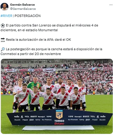 Sin embargo, el periodista Germán Balcarce adelantó que la AFA aprobará una modificación en el calendario para atrasar el clásico. Así, la nueva fecha para el duelo entre River y San Lorenzo será el miércoles 4 de diciembre en el Más Monumental.