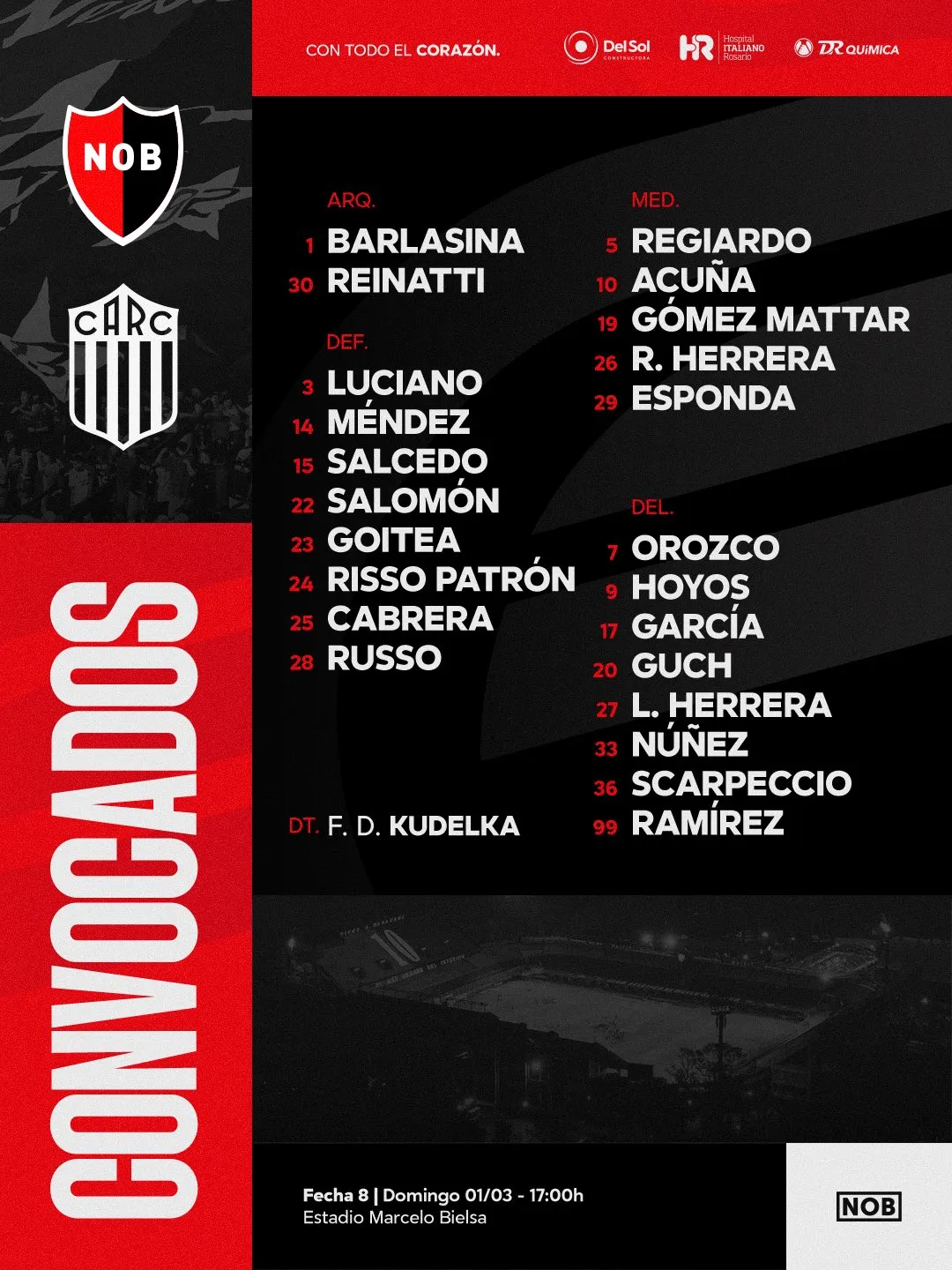 La primera alineación de Kudelka como entrenador de Newell's incluiría a Williams Barlasina; Armando Méndez, Nicolás Goitea, Cabrera o Salomón, Gabriel Risso Patrón; Luca Regiardo y Rodrigo Herrera; Walter Núñez, Facundo Guch o Valentino Acuña y Luciano Herrera; Hoyos o Cóccaro.