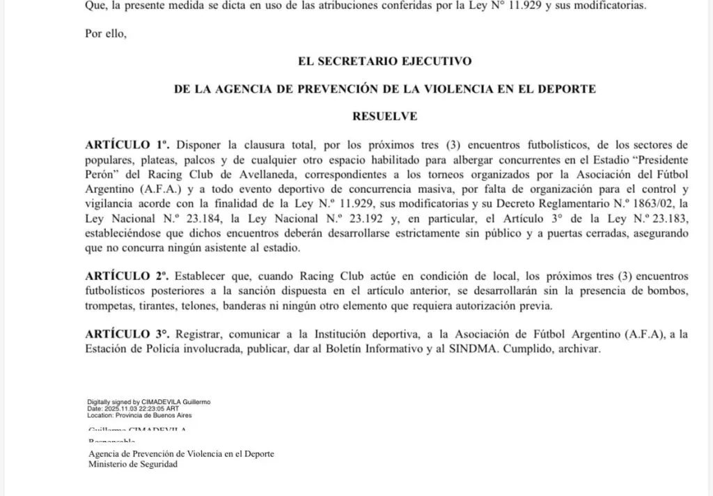 - APreViDe sancionó a Racing con la clausura del Estadio Presidente Perón, el Cilindro de Avellaneda.