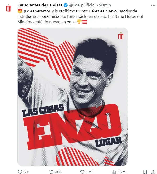 “¡Lo esperamos y lo recibimos! Enzo Pérez es nuevo jugador de Estudiantes para iniciar su tercer ciclo en el club. El último Héroe del Mineirao está de nuevo en casa”, escribió el club junto a una imagen del mediocampista, acompañada por la frase que hace un juego de palabras: “Las cosas Enzo lugar”.