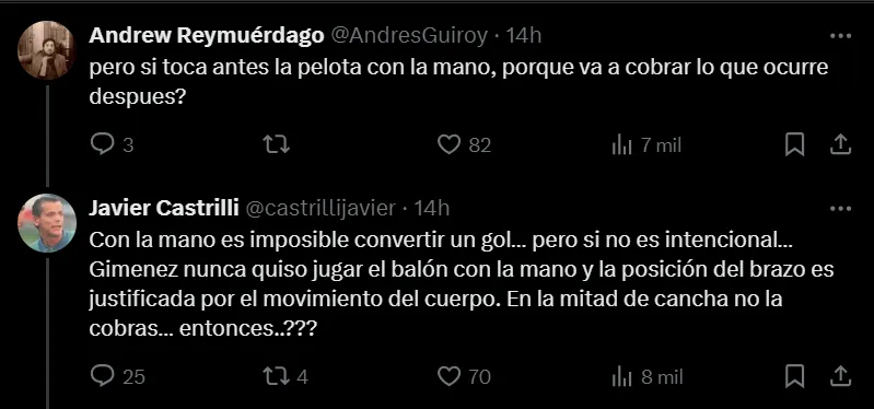 “Inmediatamente después que Giménez impulsa el balón con la cabeza y su mano, antes que el balón se introdujera en el arco de River, Armani impacta sobre Gimenez… técnicamente fue penal para Boca…“, comenzó Castrilli en su cuenta de X. Al recibir un cuestionamiento acerca de su frase, en la que él mismo señaló que hubo mano del 9 xeneize antes de la falta del arquero millonario, el árbitro redobló la apuesta.