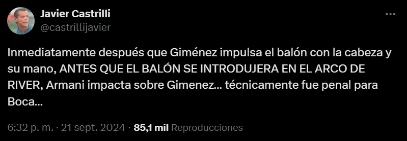 Como respuesta a ello, Castrilli expresó: “Con la mano es imposible convertir un gol… pero si no es intencional… Giménez nunca quiso jugar el balón con la mano y la posición del brazo es justificada por el movimiento del cuerpo. En la mitad de cancha no la cobras… entonces..???“. Para el experimentado ex árbitro, había penal para Boca en el final del partido, en una jugada que podría haber cambiado el resultado y la historia del Superclásico del pasado sábado.
