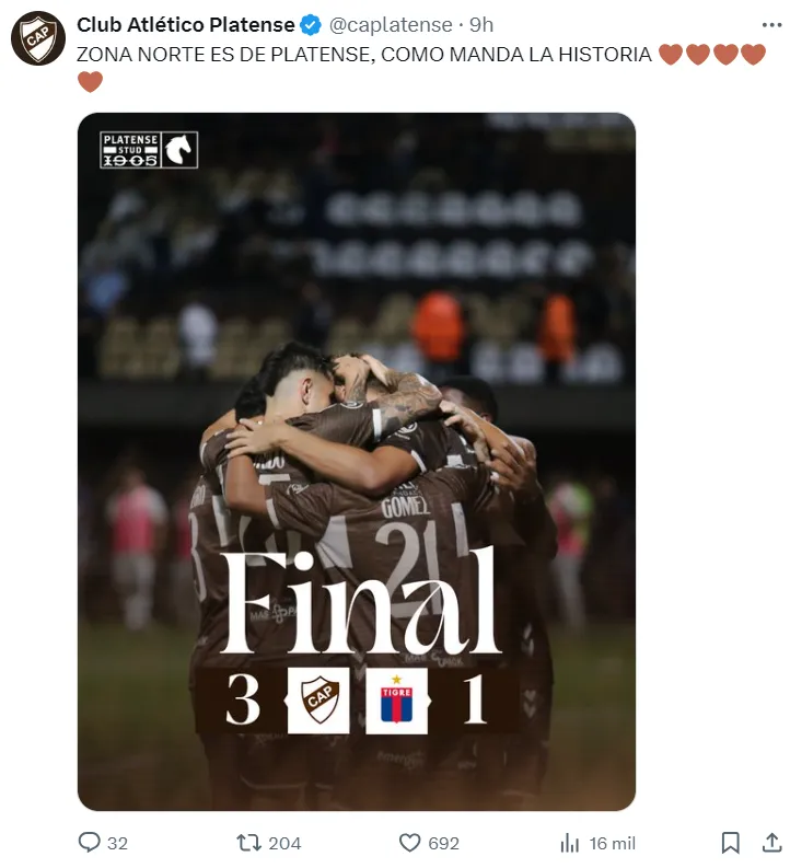 Hace tiempo que los partidos parecieran no solamente jugarse en la cancha. Los encargados de manejar las redes sociales oficiales de los equipos, en muchos casos, también juegan su partido y el CM de Platense gastó con ganas a Tigre tras ganar el clásico. Ni bien terminó el partido subió la clásica placa con el resultado del partido y lo acompañó con un contundente mensaje: “Zona Norta es de Platense, como manda la historia”.