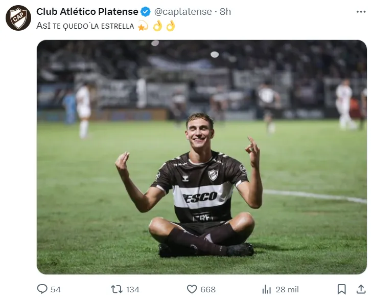 Pero la historia no quedó ahí: minutos más tarde compartió una foto de Pellegrino celebrando su gol y Tagliamonte en el piso y sacó chapa por la paternidad del Calamar sobre el Matador. Minutos más tarde llegó el tuit más polémico de todos: El autor del doblete aparece sentado celebrado su tanto con una posición similar a la que se realiza con yoga y el CM escribió: “Así te quedó la estrella”.