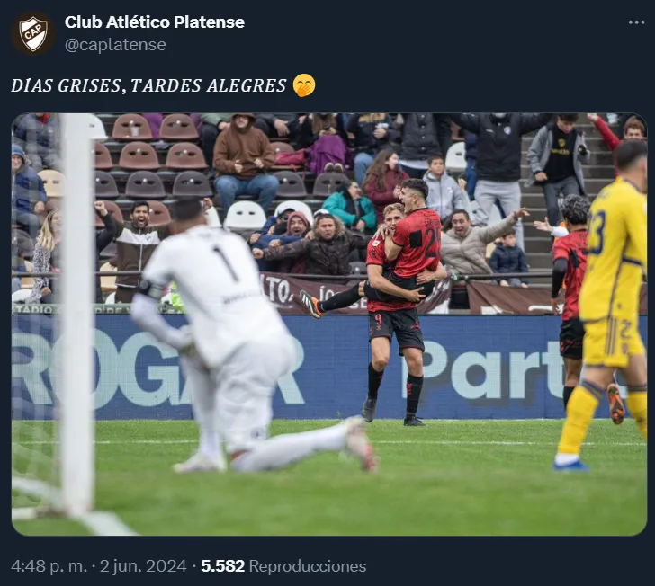 Es que, a través de su cuenta oficial de X, Platense compartió una fotografía de sus jugadores festejando y una frase contundente: “Drías grises, tardes alegres”. Claramente, estas palabras hacen referencia a lo manifestado por Darío Benedetto en medio de un conflicto que lo marginó de Boca recientemente: “Noches alegres, mañanas tristes”.