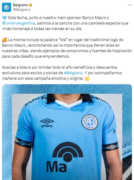 “Salimos a la cancha con una camiseta especial que rinde homenaje a todas las mamás en su día. La misma incluye la palabra “Ma” en lugar del tradicional logo de Banco Macro, reconociendo así la importancia que tienen ellas en nuestras vidas, siendo ejemplos de compromiso y fuentes de inspiración para cada desafío que emprendemos”, publicó Belgrano.