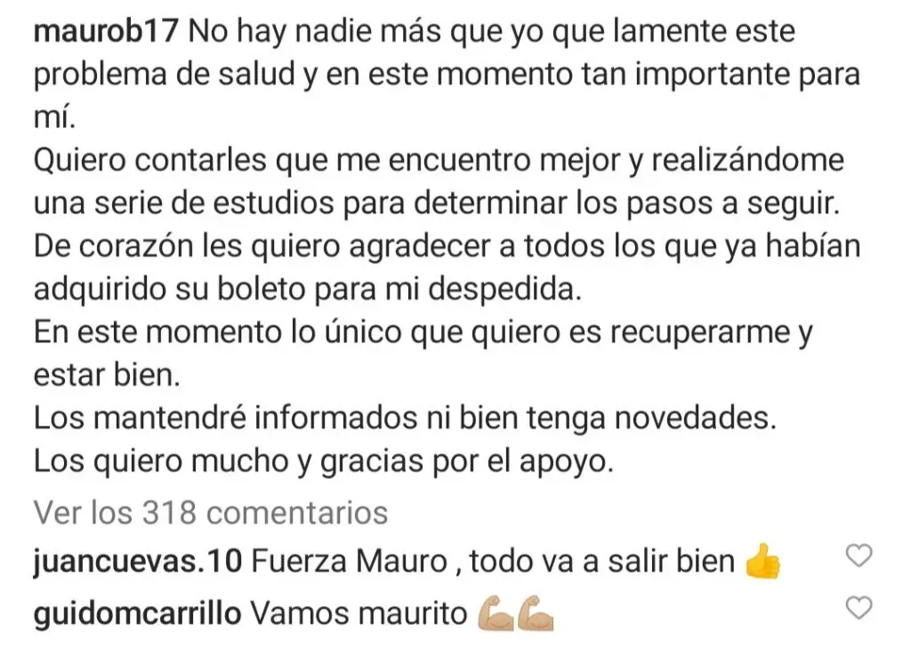 “No hay nadie más que yo que lamente este problema de salud y en este momento tan importante para mí. Quiero contarles que me encuentro mejor y realizándome una serie de estudios para determinar los pasos a seguir. De corazón les quiero agradecer a todos los que ya habían adquirido su boleto para mi despedida. En este momento lo único que quiero es recuperarme y estar bien. Los mantendré informados ni bien tenga novedades. Los quiero muchos y gracias por el apoyo”.
