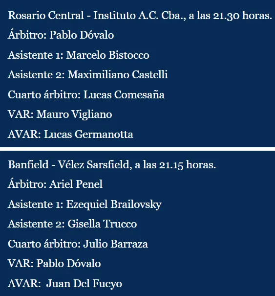 Mariano Bistocco y Maximiliano Castelli serán los jueces de línea en el Gigante de Arroyito. Lucas Comesaña, por su parte, será el cuarto árbitro. El VAR estará comandado por Mauro Vigliano y Lucas Germanotta. Este último, justamente, fue uno de los asistentes en el duelo entre el Guapo y el Rojo.