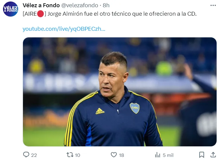 En las últimas horas, el director técnico apareció en el radar de Vélez Sarsfield, quien se encuentra en la búsqueda de un reemplazante para Sebastián Méndez. Según informó Vélez a Fondo, se trata apenas de un ofrecimiento. La CD del Fortín deberá elegir entrenador en los próximos días.