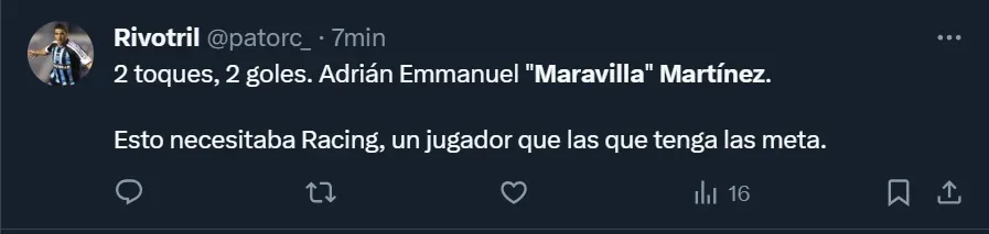 Así como hubo un gran partido de Juan Fernando Quintero, que sigue haciéndose dueño del mediocampo racinguista, el triplete de Adrián Martínez provocó que las tribunas virtuales se hicieran eco de su actuación. Incluso, hubo quienes lo colocaron por encima de la performance que tuvo Cristiano Ronaldo en el año 2017.