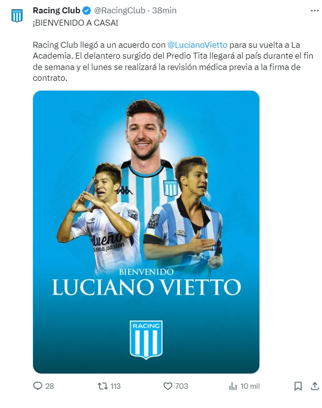 Una vez más, Racing es noticia por un refuerzo del mercado de pases. Gustavo Costas sumará a sus filas a Luciano Vietto, que regresará a su club de origen tras 10 años en el exterior. El delantero viajará al país en las próximas horas y firmará su contrato el lunes.