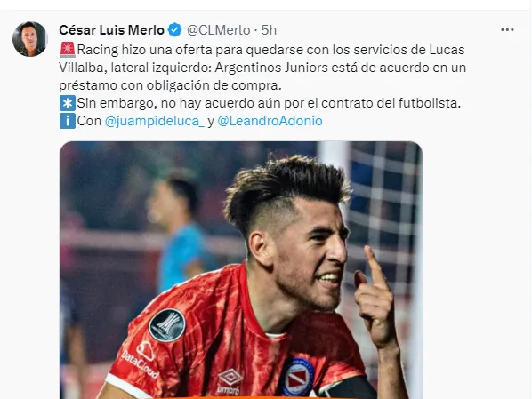 Acorde a lo informado por el periodista César Luis Merlo, Racing le hizo una oferta al Bicho de La Paternal para hacerse con los servicios del jugador, y la misma es un préstamo con obligación de compra en caso de cumplir ciertos objetivos, que fue aceptada, pero aún no hubo acuerdo con el futbolista.