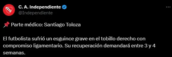 Si bien en el Rojo existía una gran preocupación por como se retiró el jugador del estadio, tras los estudios médicos se confirmó que Toloza sufrió un esguince grave en el tobillo derecho y, si bien tiene un compromiso ligamentario, no hay una lesión fuerte.
