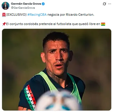 Tras el paso por Oriente Petrolero, Centurión se encuentra libre y ya negocia con un equipo argentino, con el pase en su poder. Según la información de Germán García Grova, el volante ofensivo se acerca a Racing de Córdoba para disputar la Primera Nacional en 2026.