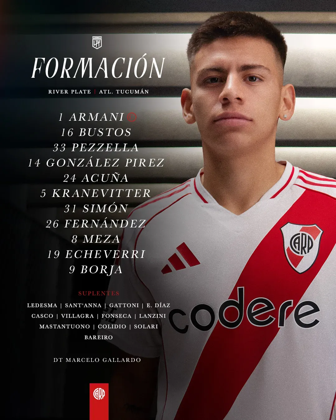 El Millonario saldría a la cancha con: Franco Armani; Fabricio Bustos, Germán Pezzella, Leandro González Pirez, Milton Casco; Nacho Fernández, Matías Kranevitter, Maxi Meza, Claudio Echeverri; Facundo Colidio y Miguel Ángel Borja.