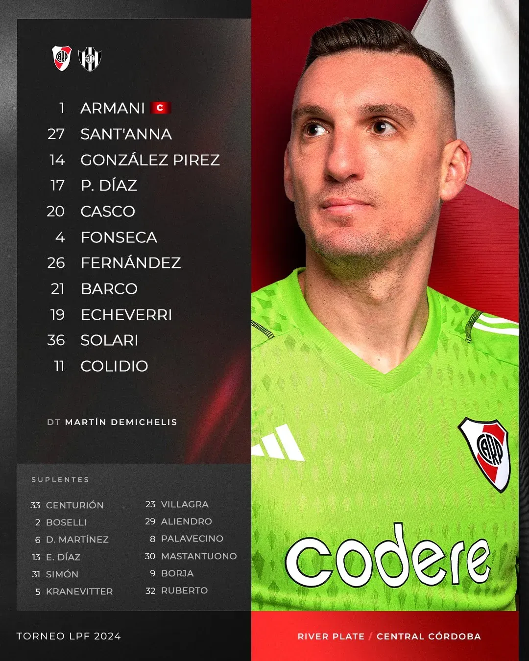Con algunas variantes, el Millonario saldrá a la cancha con: Franco Armani; Agustín Sant'Anna, Leandro González Pírez, Paulo Díaz, Milton Casco; Ignacio Fernández, Nicolás Fonseca, Esequiel Barco; Claudio Echeverri; Pablo Solari y Facundo Colidio.