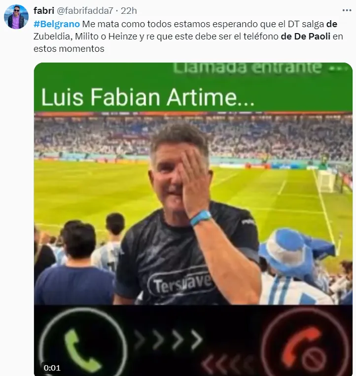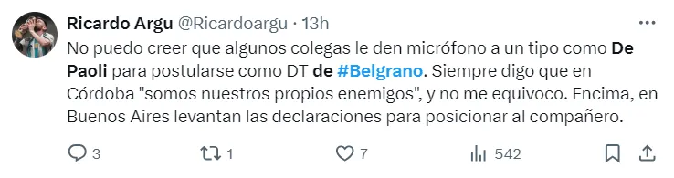 En las últimas horas, Rodolfo De Paoli se postuló para dirigir a Belgrano, tras la salida de Guillermo Farré. El relator de la Selección Argentina dialogó con el periodista Matías Juez y afirmó: “Me encantaría dirigir a un gigante como Belgrano. Nadie habló conmigo, pero me gustaría que Artime me llame. Es un gigante de nuestro país”. Dicha declaración no cayó muy simpática entre los hinchas del Pirata, que en las redes se expresaron.