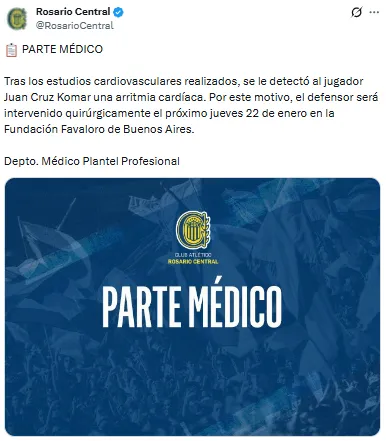 “Tras los estudios cardiovasculares realizados, se le detectó al jugador Juan Cruz Komar una arritmia cardíaca. Por este motivo, el defensor será intervenido quirúrgicamente el próximo jueves 22 de enero en la Fundación Favaloro de Buenos Aires”, anunció Rosario Central.