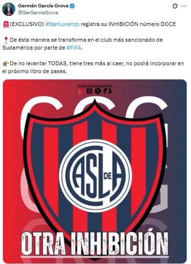Según la información de Germán García Grova, el club de Boedo recibió su 12° sanción por parte de FIFA. En las últimas semanas había recibido 5 que lo posicionaban solo una detrás de San José de Oruro en cuanto a inhibiciones de equipos sudamericanos.
