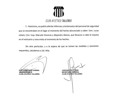 En concreto, mediante una denuncia formal redactada por el vicepresidente Guillermo Carena, y el secretario general del club, Juan Bautista Fassi, Talleres envió a la Asociación del Fútbol Argentino y a la Comisión de Ética de la AFA un pedido de sanción para Andrés Merlos, alegando con pruebas y con solicitud de testigos que los hechos relatados por Andrés Fassi fueron fidedignos a lo ocurrido en los vestuarios del Estadio Malvinas Argentinas.